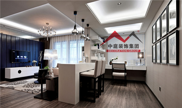 中間用一個吧臺把客廳和書房隔開,即實現(xiàn)了一個大客廳的視覺空間效果,又增加了客廳的裝飾生活情趣。