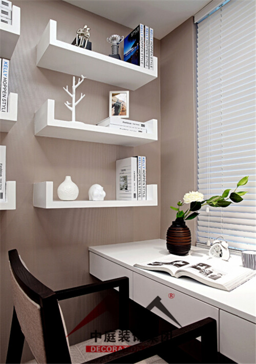 開放式的書房因為空間有限,設(shè)計師在墻面做了些架子,即起到了裝飾作用,也能用來放置書跟裝飾品,一舉兩得。