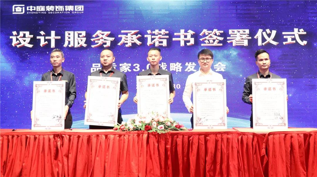 ▲中庭裝飾副總經(jīng)理鄒恒元帶領(lǐng)設(shè)計團隊管理人員簽署設(shè)計服務(wù)承諾書
