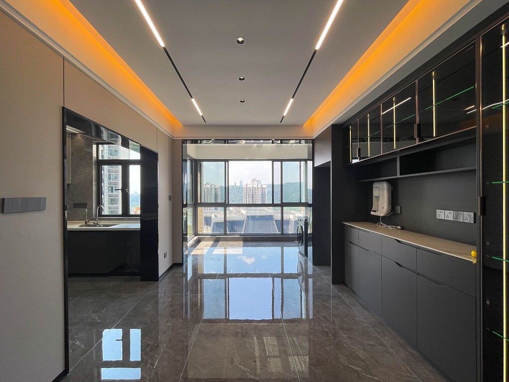 瀏覽量:441整屋采用黑色亮面護(hù)墻板,與全屋通鋪的灰色瓷磚形成和諧統(tǒng)一的整體風(fēng)格,無主燈的設(shè)計(jì),通過局部照明和燈帶的巧妙運(yùn)用,營(yíng)造出柔和的光線氛圍。雙眼皮吊頂和兩邊吊頂疊加的設(shè)計(jì),為空間增添一份獨(dú)特的層次感。