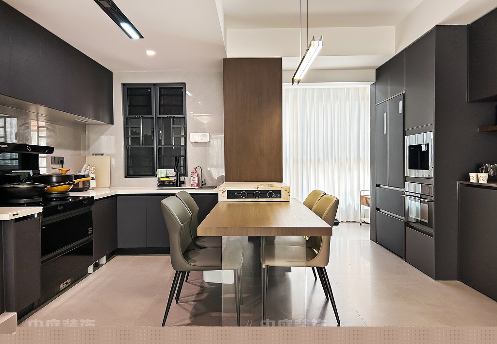 瀏覽量:51客廳以現(xiàn)代黑白灰極簡風格為核心,大面積白紗簾引入自然光線,黑色皮質(zhì)沙發(fā)質(zhì)感高級。開放式布局,深灰櫥柜與木質(zhì)餐桌形成材質(zhì)對比,線性吊燈提升精致感,功能與美學(xué)兼具,營造現(xiàn)代簡約的烹飪用餐氛圍。輕柔窗簾與柔和燈光,打造靜謐休息空間。精致的材質(zhì)選擇與合理的功能規(guī)劃,詮釋了“少即是多”的現(xiàn)代簡約居住美學(xué)。