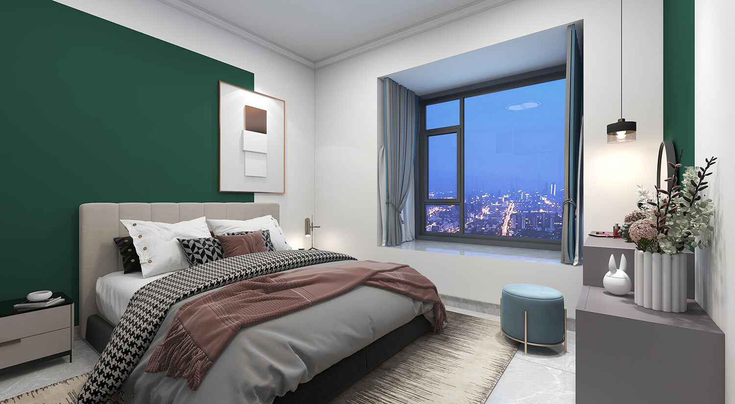 瀏覽量:315本案例戶型為:4房1廳2衛(wèi),總面積130㎡。墻壁、地板和天花板的顏色選擇明亮的白色,并搭配少量的深綠色作為點(diǎn)綴。在各種金屬質(zhì)感家具元素的襯托下,整體現(xiàn)代感十足。